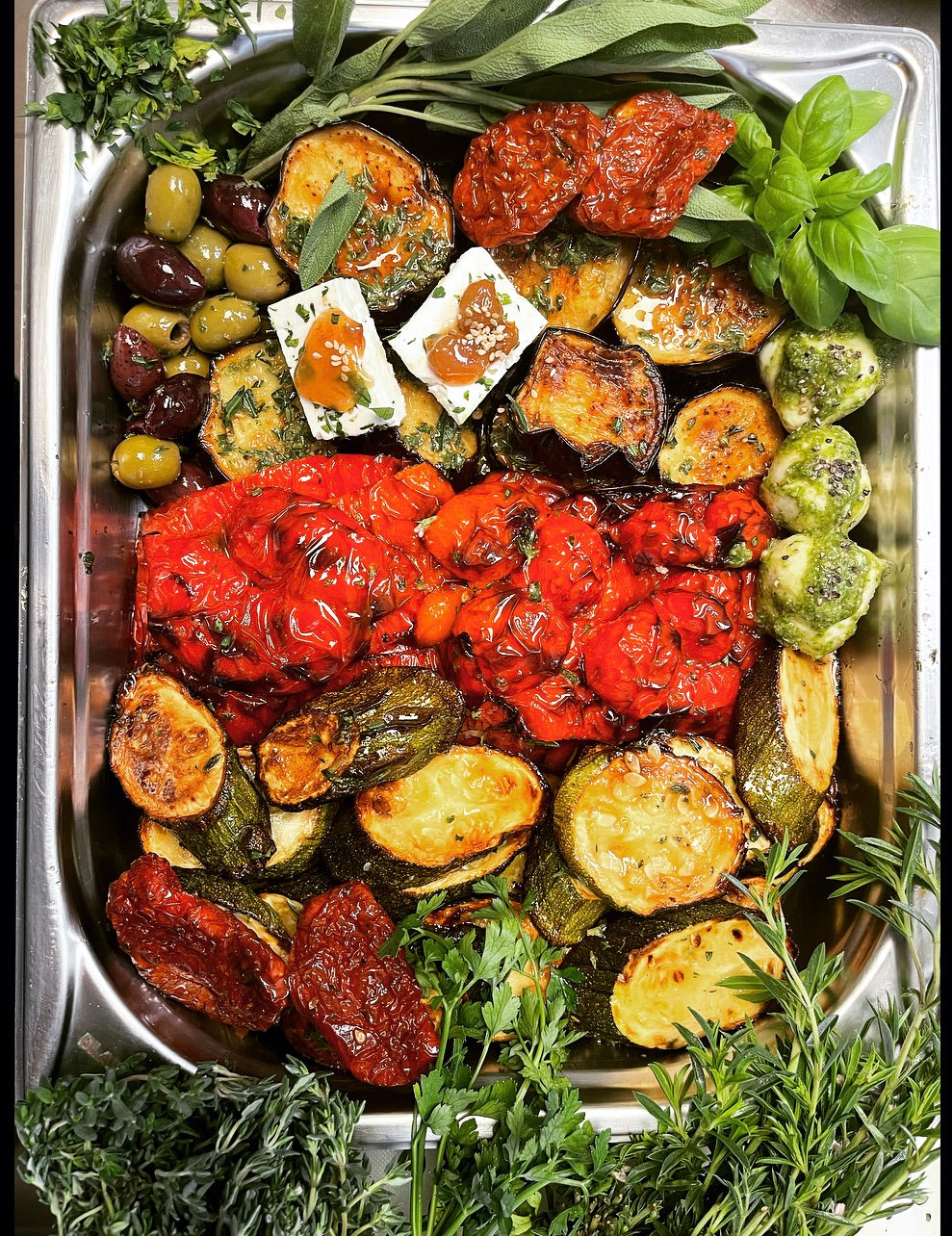 Anti-Pasti à la Wilhelm & Medné mit gegrillerter und marinierter Paprika, Zucchini, Aubergine, getrockneten Tomaten, Oliven, Mozzarella mit Pesto 18 €